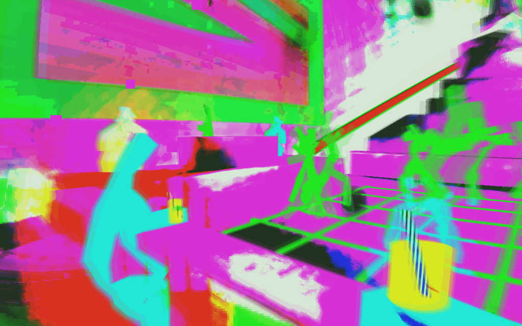 SO. Slave of God is about going to a nightclub. You start with this really basic, minimal, kinda chill menu screen which is just a throbbing orange circle. You click on it and after a moment the game loads and you’re just smashed in the face with this barrage of noise and colours. I’m not sure exactly how Stephen Lavelle created these effects, but the result is something like putting on 3D glasses and looking at an analog television tuned to the wrong channel while trapped in some weird dimension where everything consists of watercolour paint and it is raining. Lines and textures throb over adjoining walls but don’t shift with perspective, as though the three dimensions of this space are irrelevant to them. The colours of people and cups of alcohol and dancefloors smear and blur in the spaces around them. The music is a simple, looping, dance-y track that morphs and twists into different melodies depending on what part of the nightclub you move to.