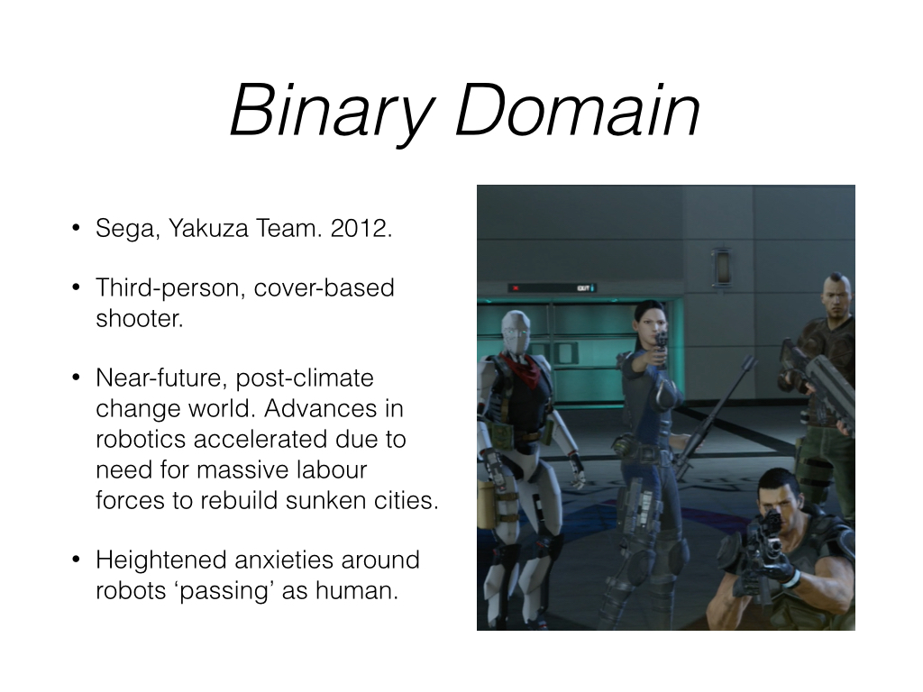 In this metaphor, the hacker stands in for the hegemonic, dominant, ‘gamer’ kind of player whose values commonly get valorised by both popular and academic videogame discourses. The cyborg, meanwhile, stands in for a much broader, more diverse spectrum of ways of engaging videogames which often get marginalised in videogame culture when the hacker is centred. I talk about this through the idea of technicity, which, really, I don’t know if I need that neologism or if I can just talk about these ideas without it, but we’ll see how I go. And I use the videogame Binary Domain really as a straight-up textual analysis and analogy for… well, really I just wanted to talk about Binary Domain. Like, I’ve been wanting to write a paper about Binary Domain for so long and I thought I could make this work, so let’s see.