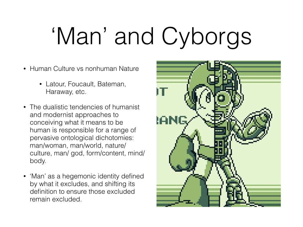 So this is where it is going to get dense. There’s this large history you can go back to through theorists such as Bruno Latour, Michel Foucault, Gregory Bateson (I wrote ‘Bateman’ in my slide, whoops), N Katherine Hayles, and obviously Donna Haraway. All of these critique this idea of how we define what ‘man’ is, or what ‘human’ is, or just where we draw the line between a ‘human’ and the ‘world’ (Bateson’s metaphor of the blind man’s stick is particularly relevant to the player-caught-up-with-the-videogame).