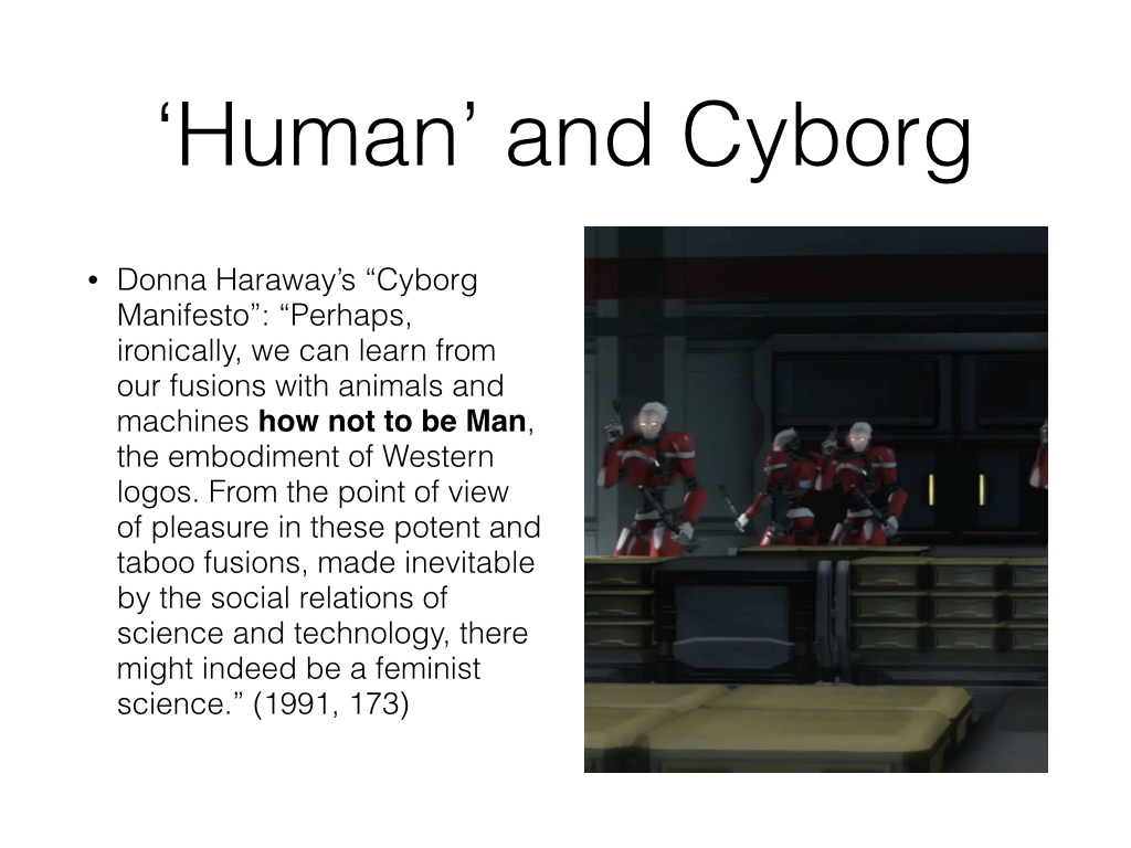 So this way of thinking about Man gets torn apart by theorists like Haraway in the 80s and 90s as computer technology gets more active while we sit in front of it all inert. Computer technology has allowed us to question our definitions of what exactly a human is, and what exactly a human ever was. Was ‘human’ ever as stable a category as we long considered it? So Haraway says in “The Cyborg Manifesto”: “Perhaps ironically we can learn from our fusions with animals and machines how not to be man, the embodiment of Western logos. From the point of view of pleasures in these potent and taboo fusions made inevitable by the social relation of science and technology there might indeed be a feminist science.”