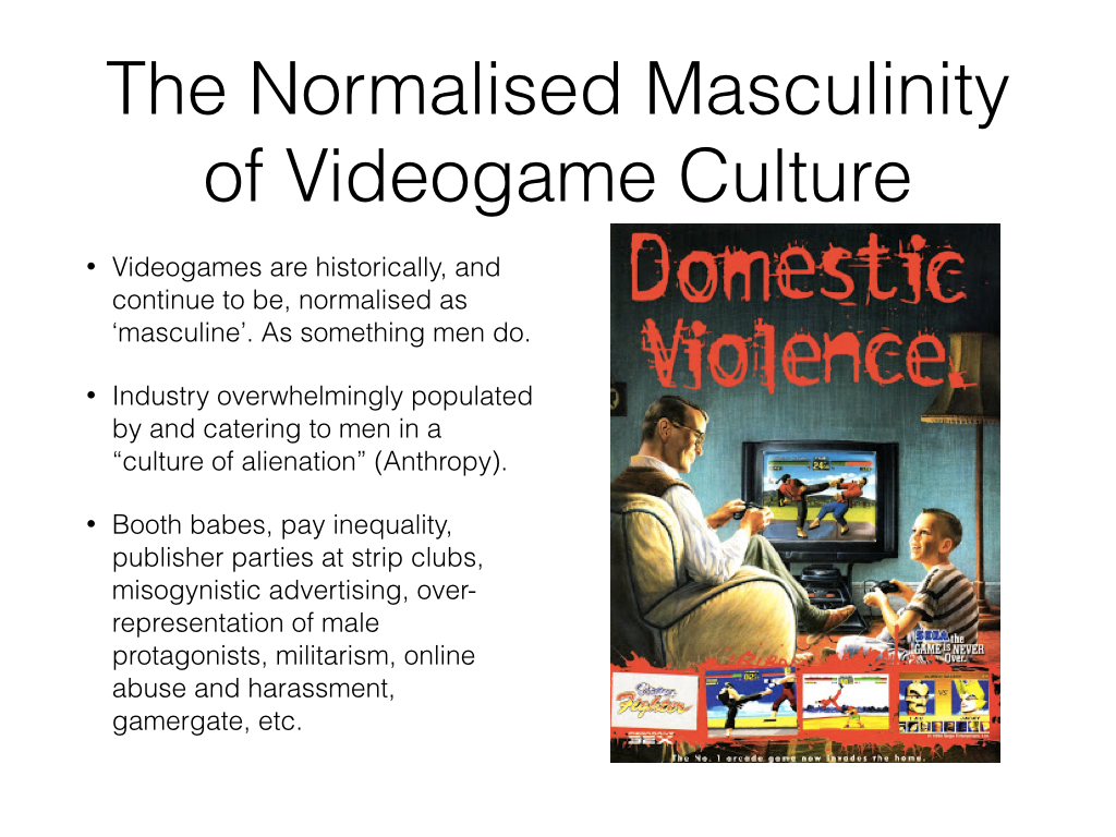 Anna Anthropy in her book, Rise of the Videogame Zinesters, which you should read if you haven’t, calls this a ‘Culture of Alienation’. Essentially this notion can be summed up as dudes make games for dude so then dudes play games for dudes and you get this cycle that is really hostile for other people to get into. You see this in the industry in particular, and obviously there are non-industrial modes of game production that are better at this, which I’ll talk about later (that ‘the videogame industry’ doesn’t address the full diversity of videogames or their creators is a really important point we are terrible at remembering). But things like booth babes and pay inequality. There’s been times at GDC where publishers or other organisations organise parties at strip clubs. And obviously gamergate and all that. You have this normalised masculinity there underneath the much more explicitly and hostilely sexist stuff. The pervasive type that means a woman who walks into a games shop is presumed to be buying a game for her boyfriend.
