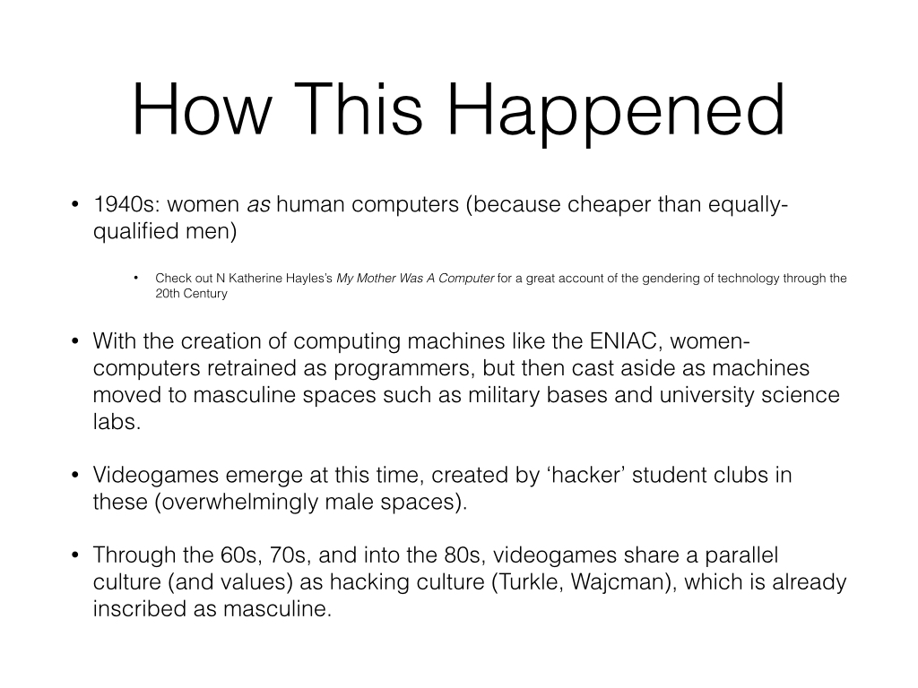 Judy Wajcman then critiques Turkle for being weirdly gender essentialist (Turkle just assumes that males are more inclined to computers), and also forwards some great stuff about how technology has been naturalised or normalised as masculine through this time, despite there being nothing particularly different about men that makes them better at computers. Wajcman has this 1991 book Feminism Confronts Technology with a great chapter on “Technology as Masculinist Culture.” I think it is really interesting to look at this feminist stuff written about technology from before videogames got interested in gender. You realise the stuff they’re saying is exactly the stuff we’re saying now, and it’s really interesting.