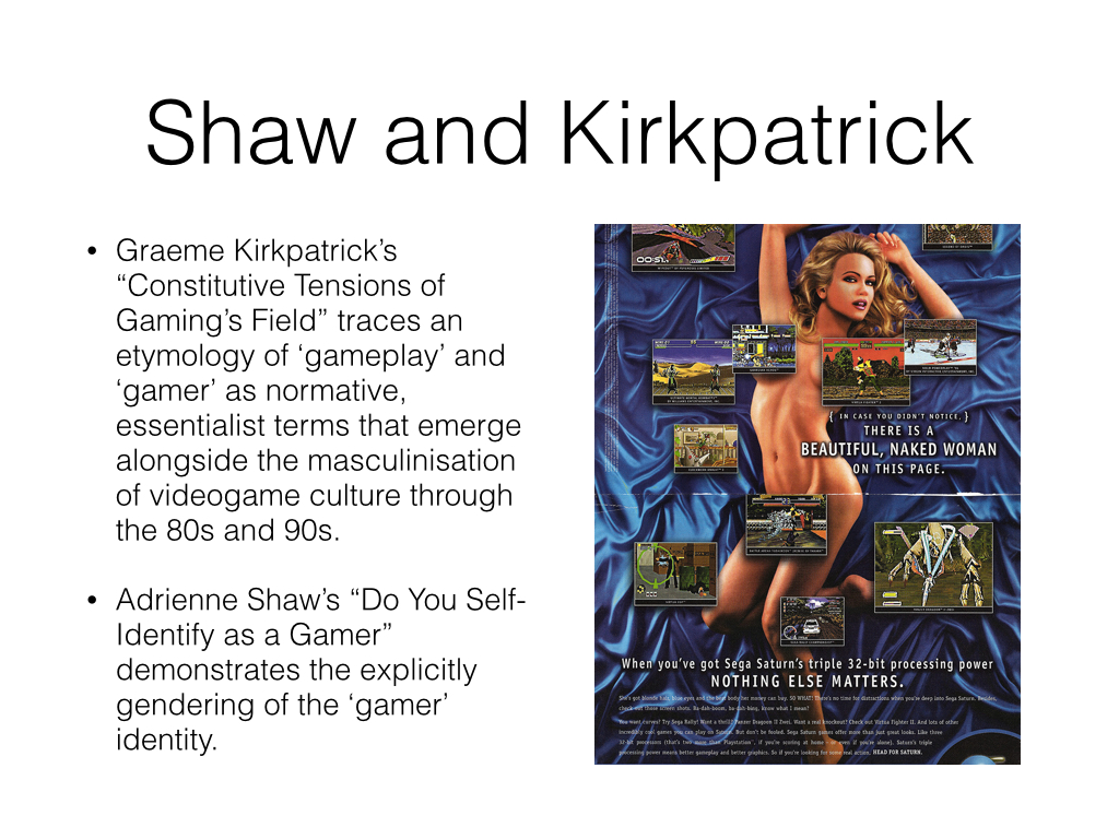 More recently, we’ve got Adrienne Shaw, of course, and Graeme Kirkpatrick. Kirkpatrick’s article in Game Studies traces the etymology of ‘gameplay’, the word ‘gameplay’ itself, as it appears in UK gaming magazines through the 80s up to the mid-90s. And kind of the word gamer as well. He traces the introduction of these words and their essentialism as a core audience gets to decide what ‘gameplay’ is and which games have it and which games don’t. At the same time they get to define what a gamer is. So here there’s this parallel shift in videogame culture to becoming more explicitly masculinised. The perceived audience of these magazines and marketing around this time shifts to speaking directly to young teenage boys rather than parents, and marks as ‘other’ those women and adults who don’t get videogames. The non-gamers.