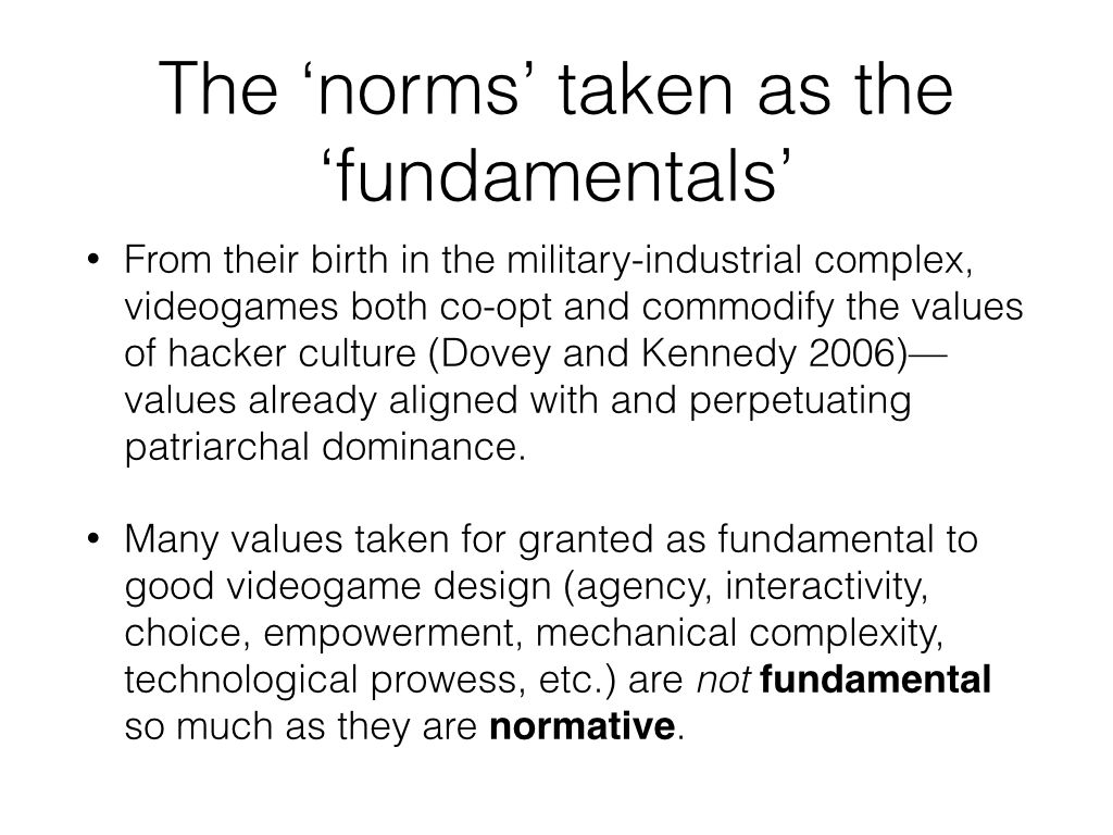 So from this history, where these hacker values go from Enlightenment Man values, patriarchal 20th Century values, into hacker values, into late-20th century and early 21st Century gamer values, you can trace this thread and see these values being brought from one to the next. So you get things like this idea that ‘agency is good’. The player having more agency is a good thing for a videogame to have. Or they should be ‘more’ interactive, or we should have more choice, or we should have more power. That videogames should be mechanically complex. That we should be talking about mechanics and not narrative. Or that representation doesn’t matter because rules or something. Games are ‘more immersive’ if they have better graphics. These are all underlying assumptions in a lot of game studies. Not as much as they used to be, but they’re still kind of there and taken for granted.