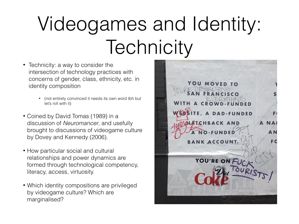 So technicity is a useful term for thinking about identity composition in terms of gender, class, ethnicity, and how those intersect with technological practices and access, such as literacy of computers and stuff. Somewhere like San Fransisco provides a useful place to think about drastically varied technicities clashing. David Tomas coined the term while discussing William Gibson’s Neuromancer, and Dovey and Kennedy bring it to videogames in a real constructive way. It’s essentially aw ay to think about how identity composition and technological competency related in the modern world. (I run out of time here so I don’t go into it much more but, ultimately, when you bring technological backgrounds into questions of identity, you see how how videogame culture and its values are formed through different identities that are themselves caught up with technologies.)