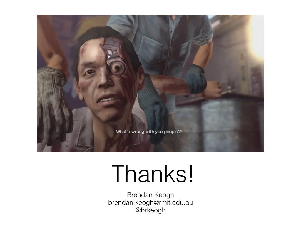 So in conclusion, these kind of metaphoric figures provide an opportunity to conceptualise both dominant and marginalised identities in videogame culture. They provide a way to interrogate and disrupt what we often take for granted as fundamental to good videogame design. They provide an intervention in how we talk about and evaluate videogames, both scholarly and in popular discourses. Just as the conceptual definitions of human shift over time and in Binary Domain to ensure the exclusion of certain identities, so to does the definition of videogames to ensure the dominance of a certain status quo.